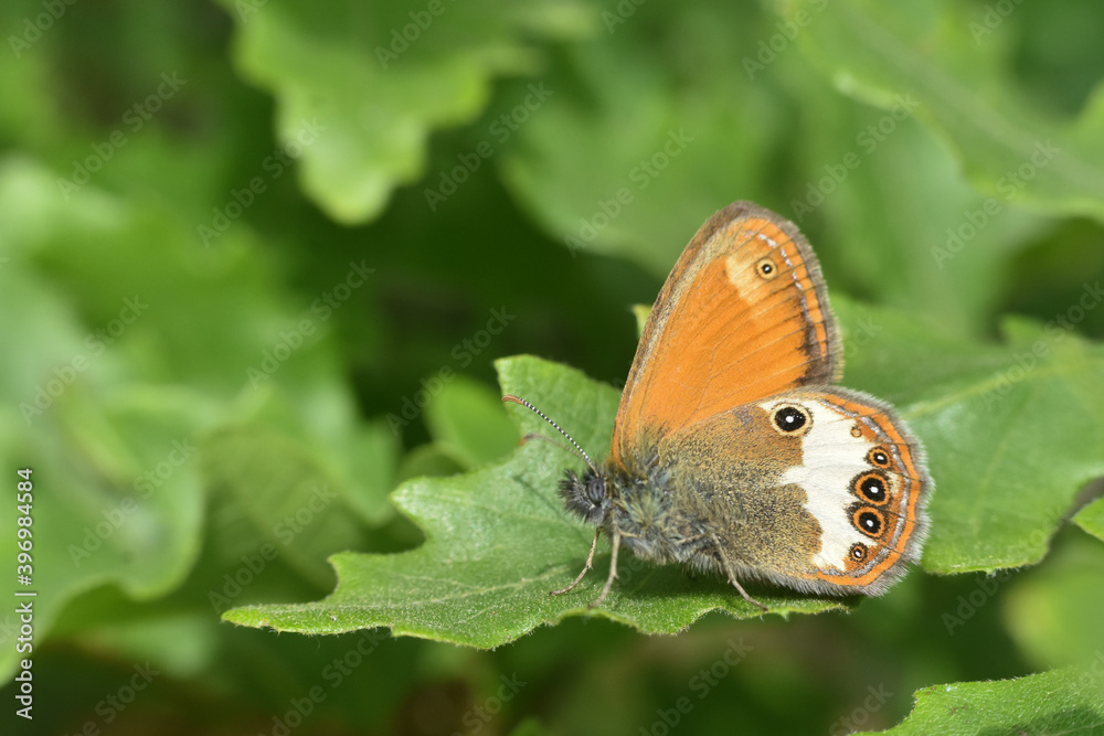 The Coenonympha arcania or Pearly Heath butterfly on a green leaf close up
