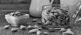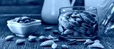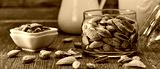 Almonds-nut kernels lie on wooden planks, against the background of glass dishes.