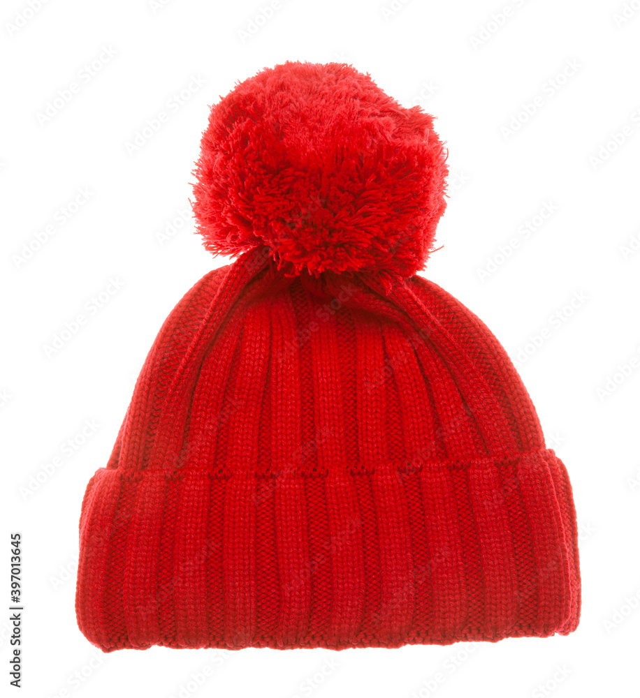 Red knit winter bobble hat isolated on white