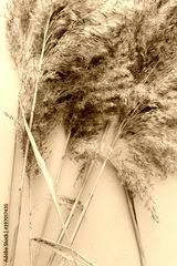 Dry pampas grass reeds agains on beige background. Beautiful pattern with neutral colors. Minimal, stylish, monochrome concept. Flat lay, top view, copy space. Set sail champagne trend color 2021
