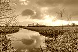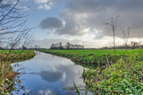 Dramatic skies reflect in a wide ditch in the open polder landscape between Leiden and The Hague in the Netherlands