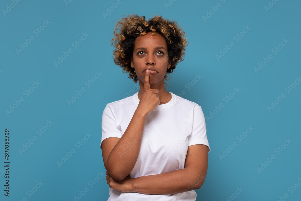 African american woman holds chin, looks puzzled aside, contemplates about something