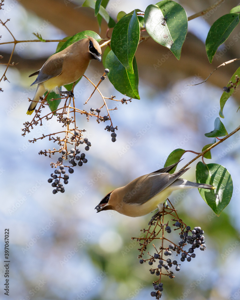 Cedar Waxwings share a berry. Santa Clara County, California, USA.