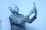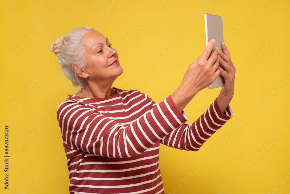 Caucasian woman makes a selfie. Studio shot on yellow wall.