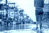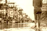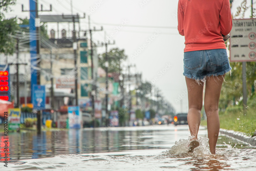 girls in raincoats and road flooded with torrential rains, their feet walk through puddles city, splashing water to the sides, the flood is on street, car is driving on water