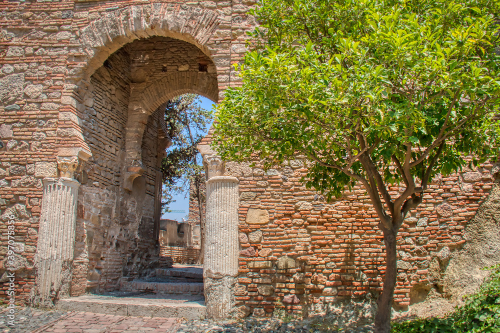 The 'Puerta de las Columnas', (door of the columns), located in the Alcazaba, a palatial fortification from the Islamic period of the 11th century built in Malaga, Costa del Sol, Andalusia, Spain.