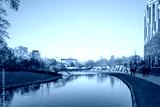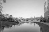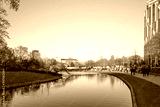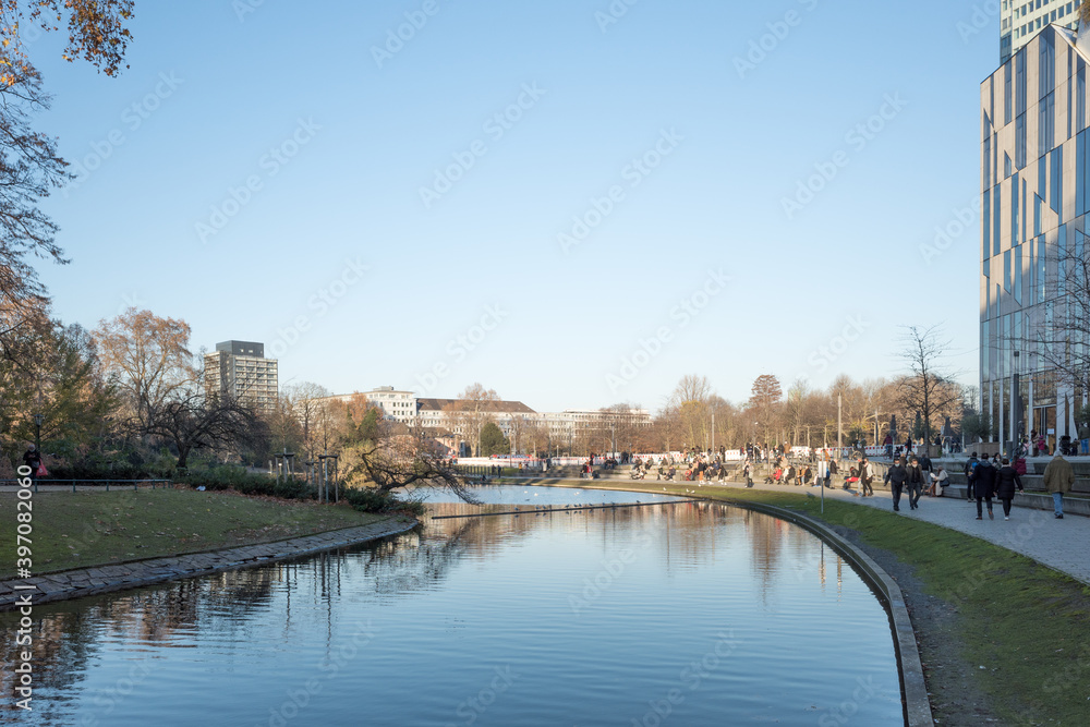 Outdoor sunny view around park and pond beside Kö-bogen shopping mall from Corneliusplatz in Düsseldorf, Germany.