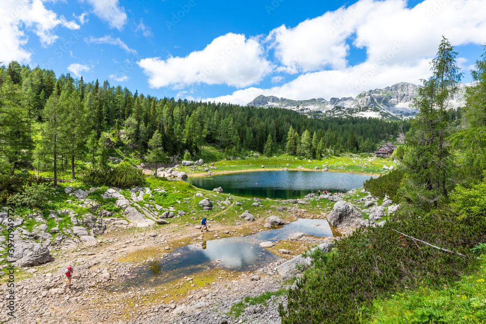 A beautiful view of the Triglav mountains and the lakes during the hike Triglav Seven Lakes, Triglav national park, Slovenia.