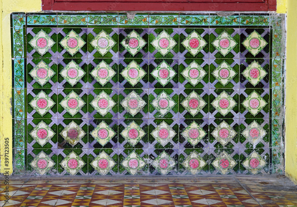 View of colorful Peranakan tiles in historic George Town, Penang, Malaysia, a UNESCO World Heritage site