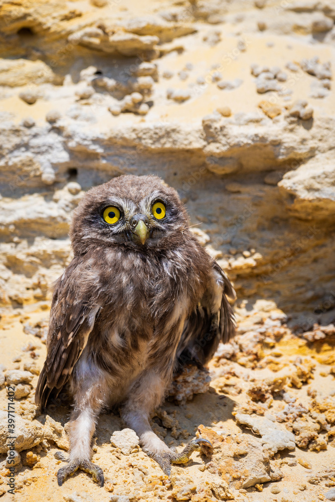 Little owl or Athene noctua perched on ground