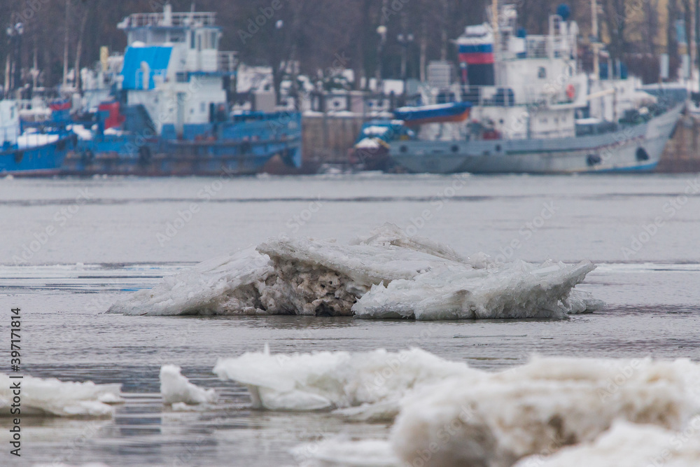 Drifting iceberg floes float on the water. Breaking of the ice on the river in the spring