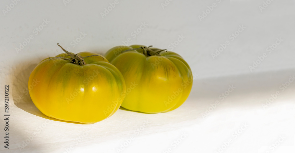 Two green tomato at a white wall. Raw food waiting to get ripe. White background. Day light falls on fresh harvested fruits, but the other half is in shadow