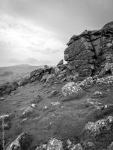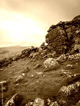 Sunset view of Dartmoor National Park, a vast moorland in the county of Devon, in southwest England