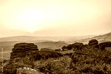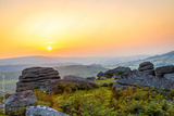 Sunset view of Dartmoor National Park, a vast moorland in the county of Devon, in southwest England