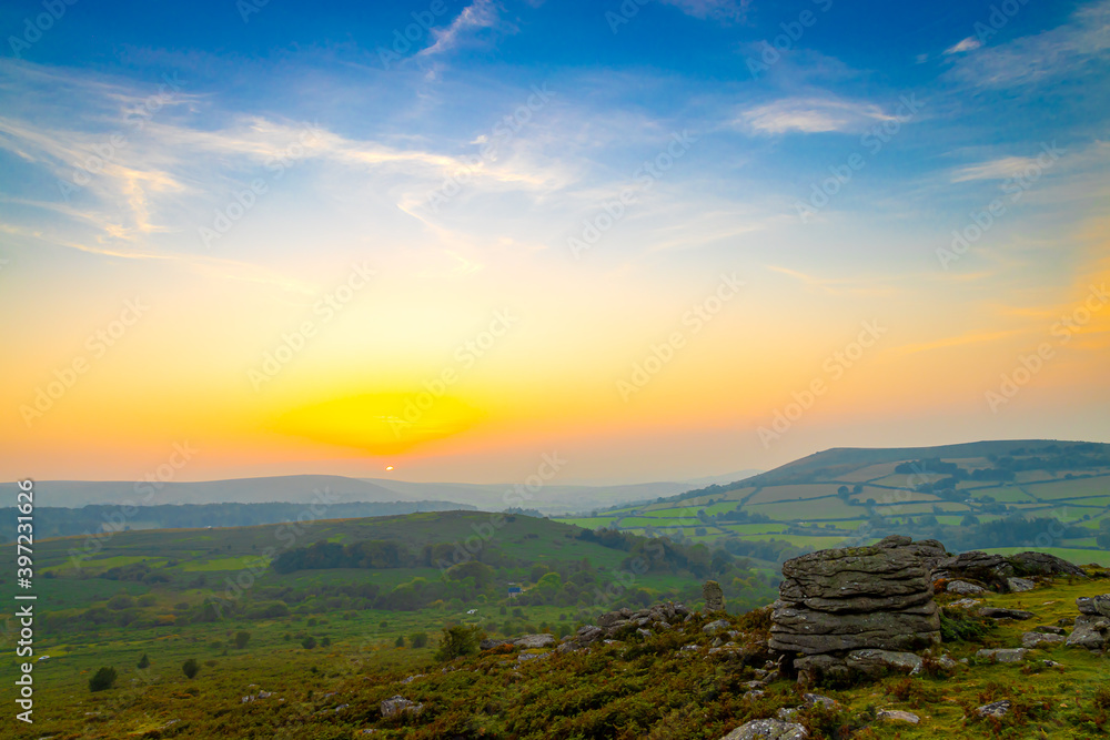 Sunset view of Dartmoor National Park, a vast moorland in the county of Devon, in southwest England