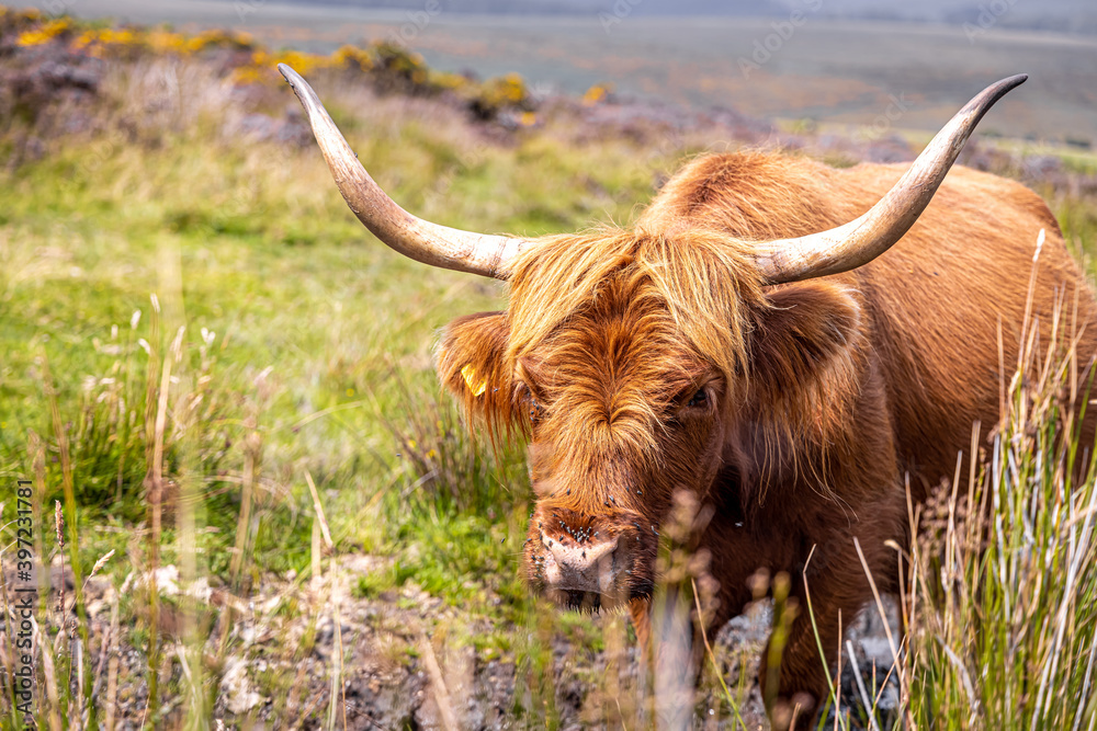 Hairy cow of Dartmoor National Park, a vast moorland in the county of Devon, in southwest England