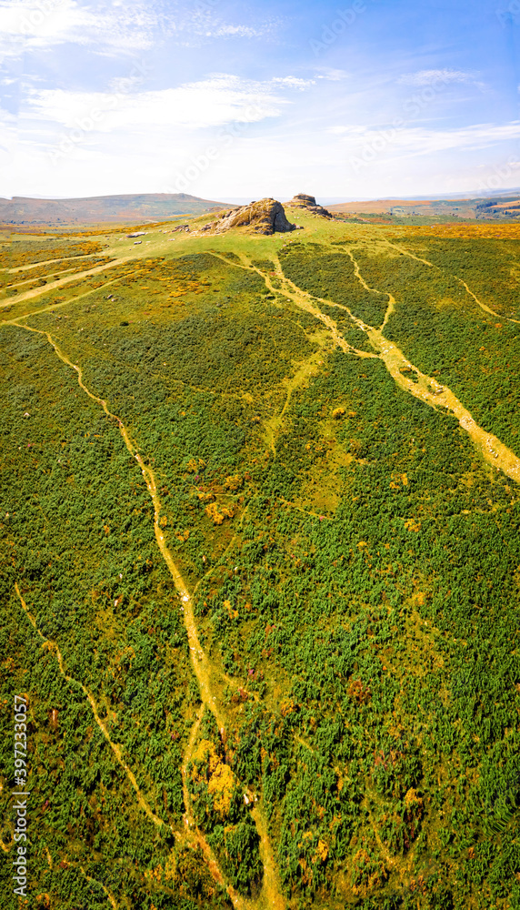 A view of Haytor Rocks in Dartmoor National Park is a vast moorland in the county of Devon, in southwest England