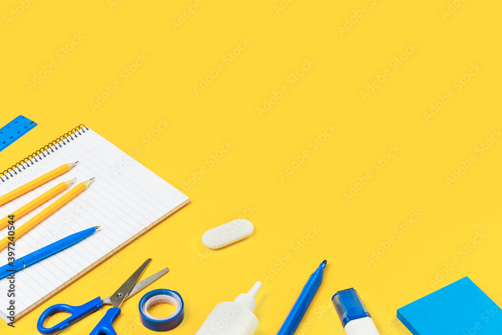 Assorted office and school white and blue stationery on bright yellow background. Organized knolling for back to school or education and craft concept. Selective focus. Copy space