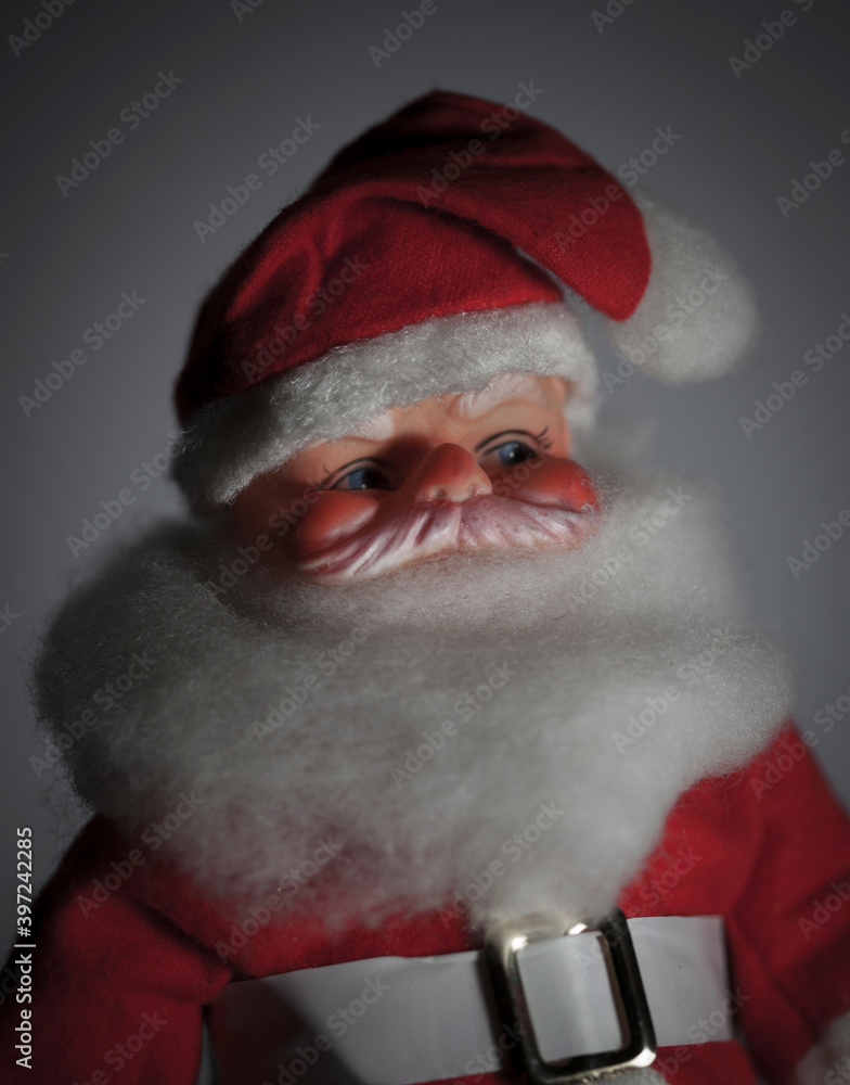 Closeup of a vintage 1950s creepy Santa Claus doll with red cap and coat and white beard