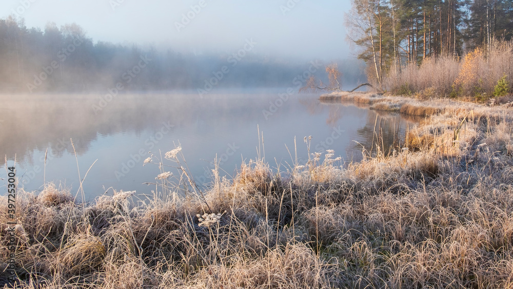 landscape with First frost on a forest blue misty lake with a beautiful birch on the shore, autumn landscape in bright morning