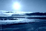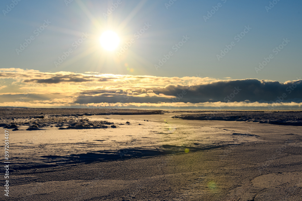 Arctic landscape in winter time. Small river with ice in tundra.