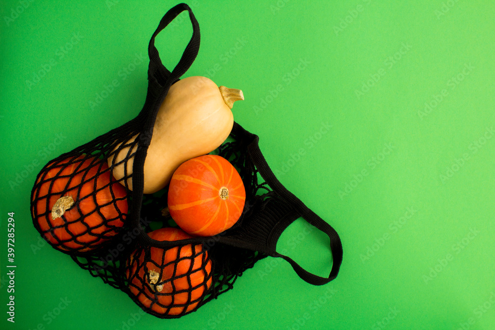 No plastic bag concept. Mesh shopping black bag with pumpkin on the green background