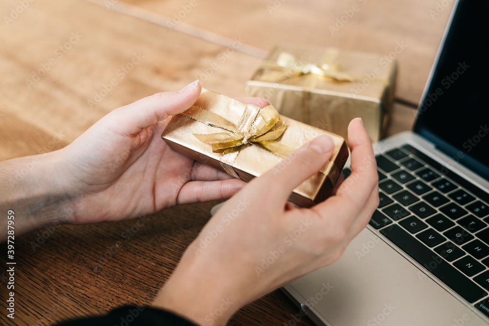 young asian girl buying christmas presents in online shopping, sales and discounts promotions during the Christmas holidays, online shopping at home and lockdown coronavirus.Xmas