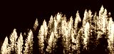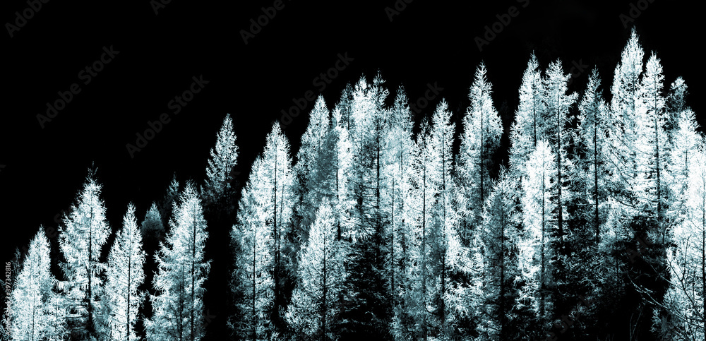 Beautiful white christmas trees isolated on a black background. White trees covered with snow, panorama view.