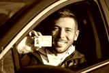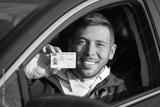 Attractive smiling young man proudly showing his driving license out of car window. Man has got driving license and feels very happy and excited. Ready to drive