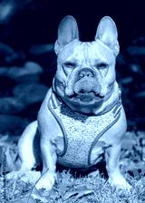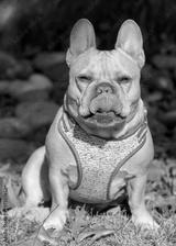 Male French Bulldog Sitting and Licking His Nose. Off-Leash Dog Park in Northern California.