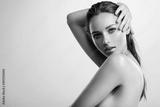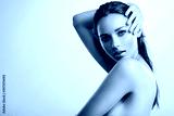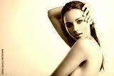 Young beautiful woman with healthy perfect body. Tanned body of an attractive white girl which posing at studio. Brunette woman hiding her naked body with hands.