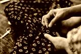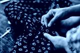 Asian woman's hand is embroidered with tribal native fabric (dyed indigo color). folk art, crafts.