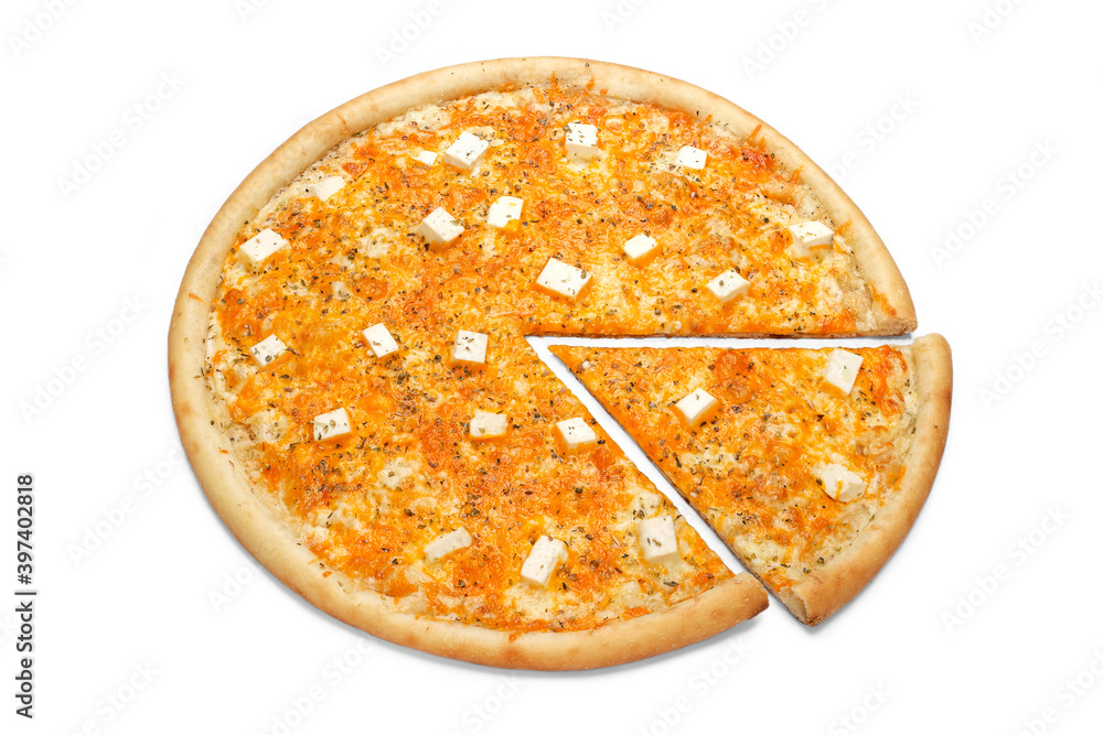 Fresh Italian classic cheese pizza, slice of pizza, isolated on white background. Advertising flyer or poster for the pizzeria menu.