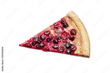 A slice of sweet berry pizza for dessert. Advertising flyer or poster for pizzeria menu, isolated.