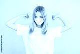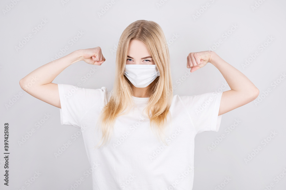 Happy healthy strong young blonde woman in a medical protective mask on her face, showing biceps on her arm over white background.