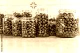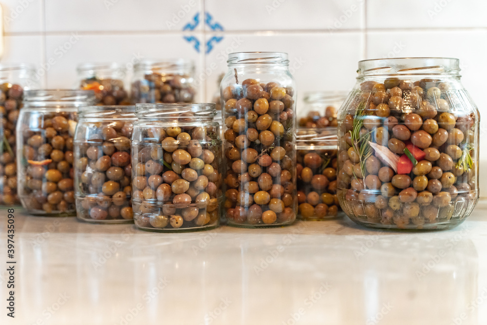 Glass jars of home made pickled olives isolated on white kitchen background. Olive oil.