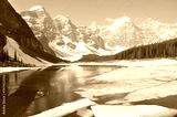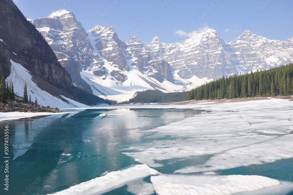 Moraine lake under the ice at spring morning. Banff National park.