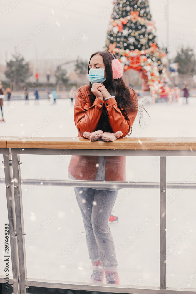 Beautiful happy stylish girl in furry earmuffs, medical face mask have fun on ice skating rink. Young cheerful pretty woman skate on outdoor Christmas ice rink. Winter holidays season personal safety