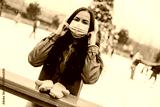 Cheerful attractive girl in furry earmuffs wear medical face mask on outdoor ice skating rink. Happy beautiful woman put on protective face mask, skate on ice rink. Christmas winter holidays safety