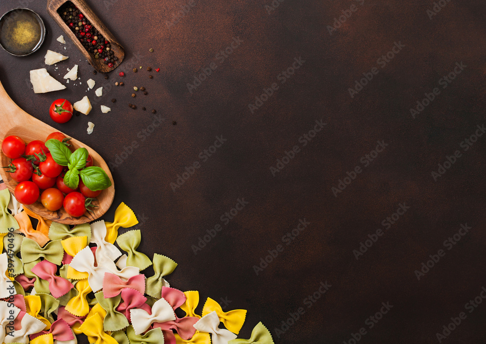 Raw tricolore farfalle pasta with parmesan cheese and tomatoes, salt and pepper with oil on brown background.