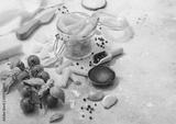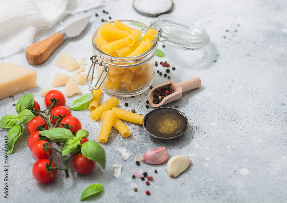 Penne pasta in glass jarl with basil with garlic and oil on light background with parmesan and tomatoes.