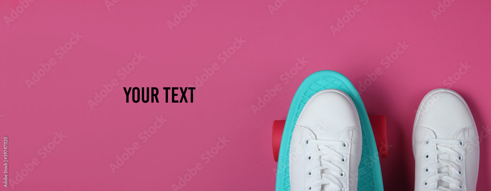 Stylish white sneakers with cruiser board on pink background. Copy space. Summertime fun. Studio shot, top view.