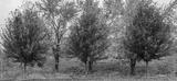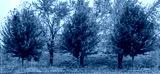 A trio of brilliant red autumn blaze maple trees on a cloudy day in the forest preserve . Sunlight filters through the canopy, casting a warm, amber glow over the scene.