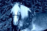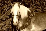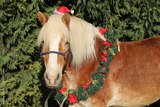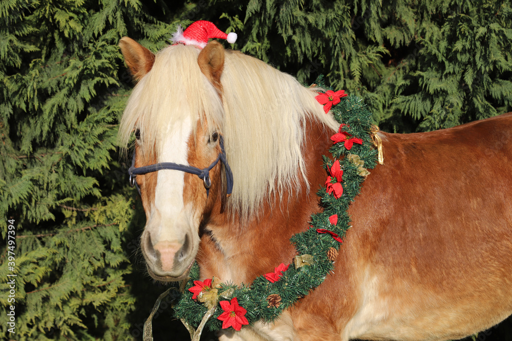Gentle horse dressed like Santa Claus's, wearing red cap