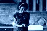 Smiling attractive young african american woman in headphones using mobile music library application, choosing favorite audio, starting preparing food on weekend in kitchen, modern tech concept.