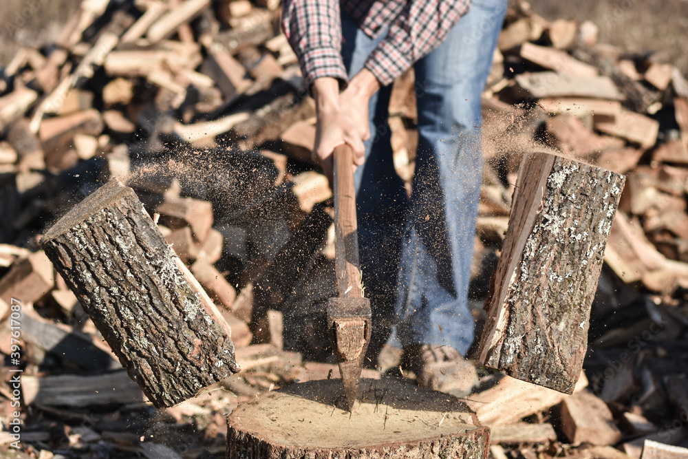 Lumberjack chopping wood. Illustration of a strong man chopping wood with an axe