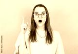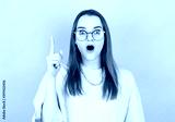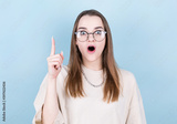 Close-up portrait of charming young woman in eyeglasses pointing with finger, looking at camera, isolated on blue background