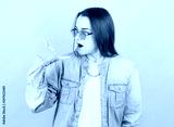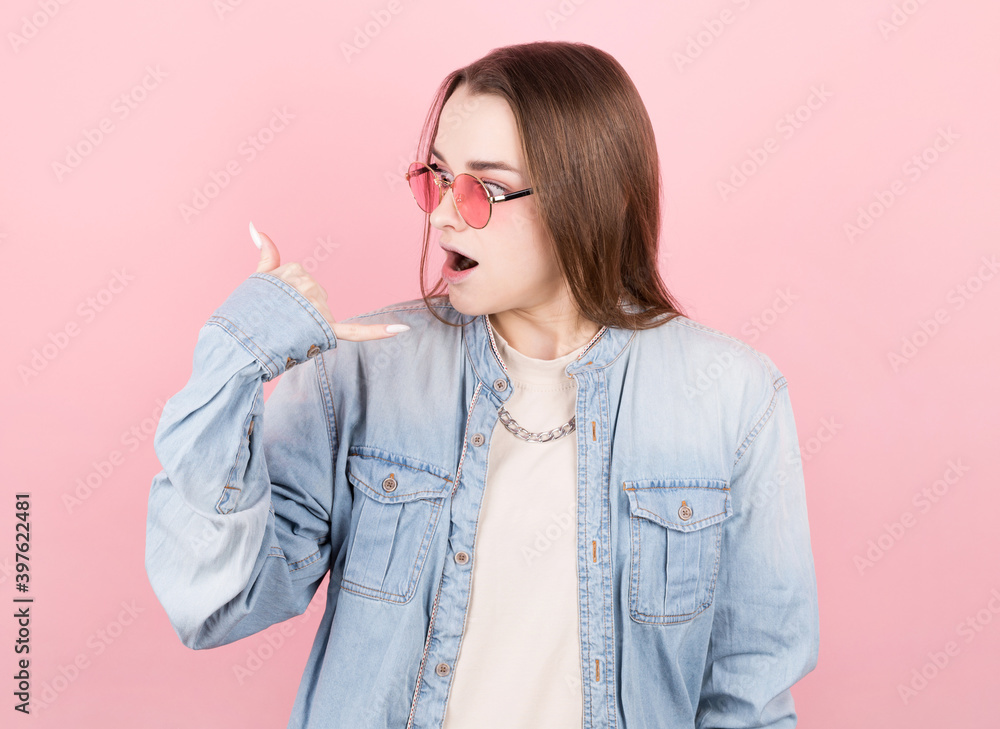 Young girl looks surprised and amazed while watching the phone gesture of her hand. Сoncept of buying phone and talking.