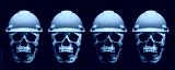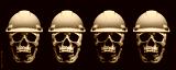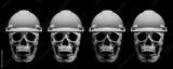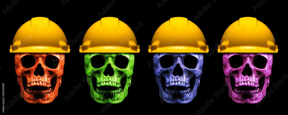 Different color human skulls on a black background in a yellow construction helmets. Deadly accident concept.