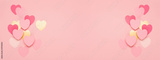 Pink, golden paper hearts on pastel pink background. Festive holiday greeting card for Valentines, Birthday, Woman or Mothers Day.